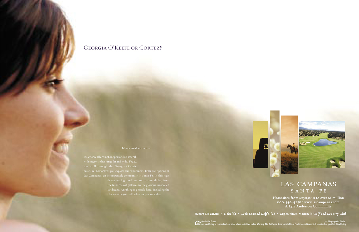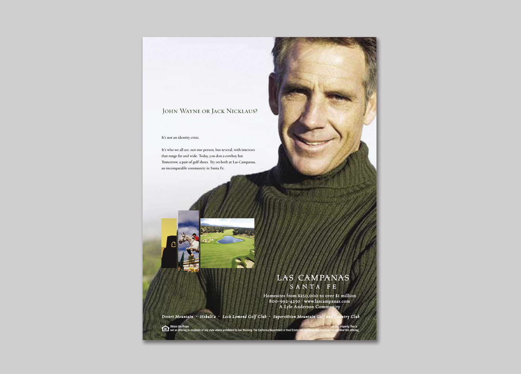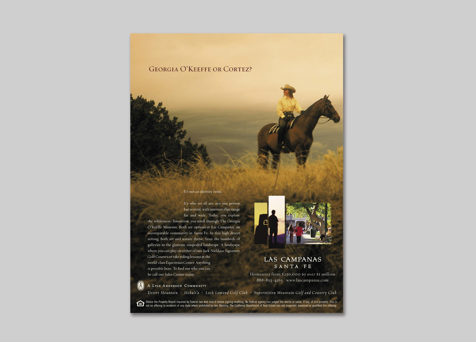 These ads were created for the private golf and equestrian community Las Campanas located in Santa Fe New Mexico. The ads played up the dual nature of the property. Today you’re playing a round of 18. And tomorrow you’re donning a cowboy hat and boots and riding your favorite mare around the estate.