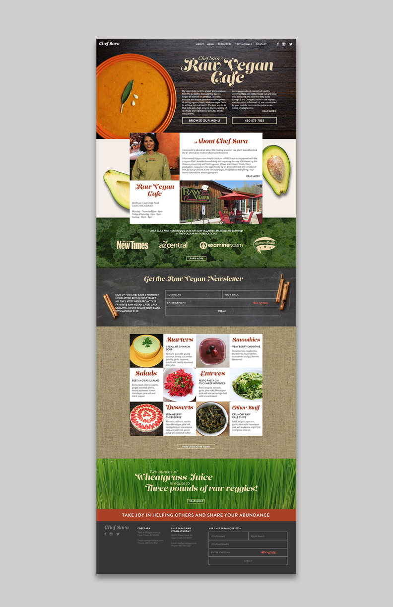 Chef Sara had two websites, one for her restaurant and one for her vegan cleanse and training program. There was a lot of confusion due to two separate websites. I was charged with combining the sites into one cohesive, easy to use website.