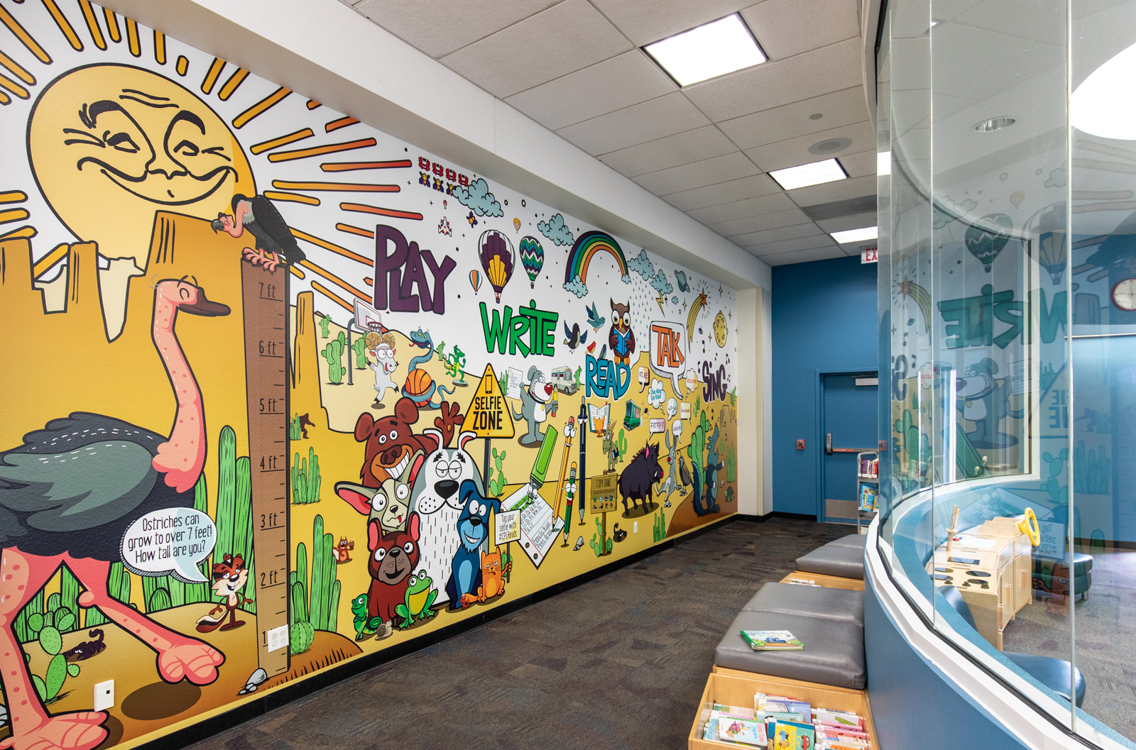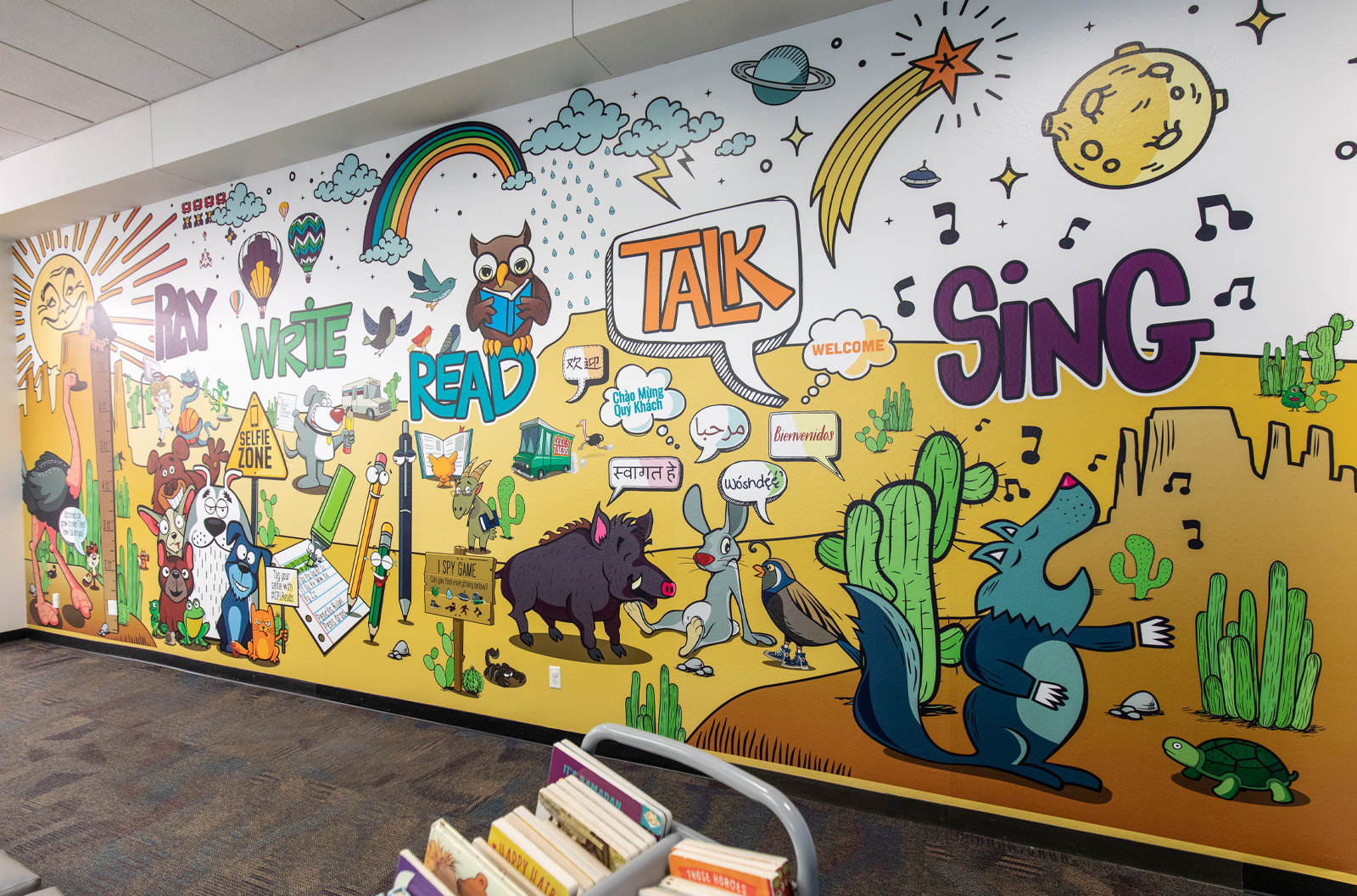 I was asked to create a mural for the Downtown Library Space. They wanted a mural set in the desert that represented the five critical skills and was still fun and allowed for some interactivity for kids. The solution I developed was focused on different desert-dwelling animals (and not so desert-dwelling…) doing activities that fell under the five critical skills. There’s a coyote singing, a group of animals talking to each other, some are playing basketball, etc. There are even a growth chart and a selfie station for kids to pose for their parents with the books they’ve checked out; with a note to tag the library if posted to social media. Given the scale, I thought a game of “I spy” would be a great way for patrons to really see all that is happening in the mural.